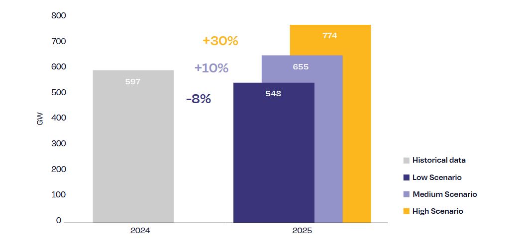 The association outlined three scenarios for 2025: a “High Scenario” with up to 774 GW of new additions; a “Mid Scenario” with 655 GW, which the report’s authors called the most likely; and a “Low Scenario” projecting just 548 GW.